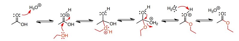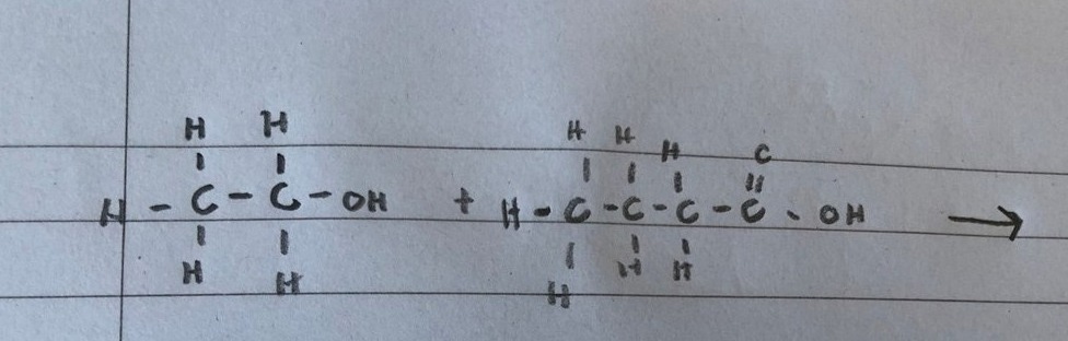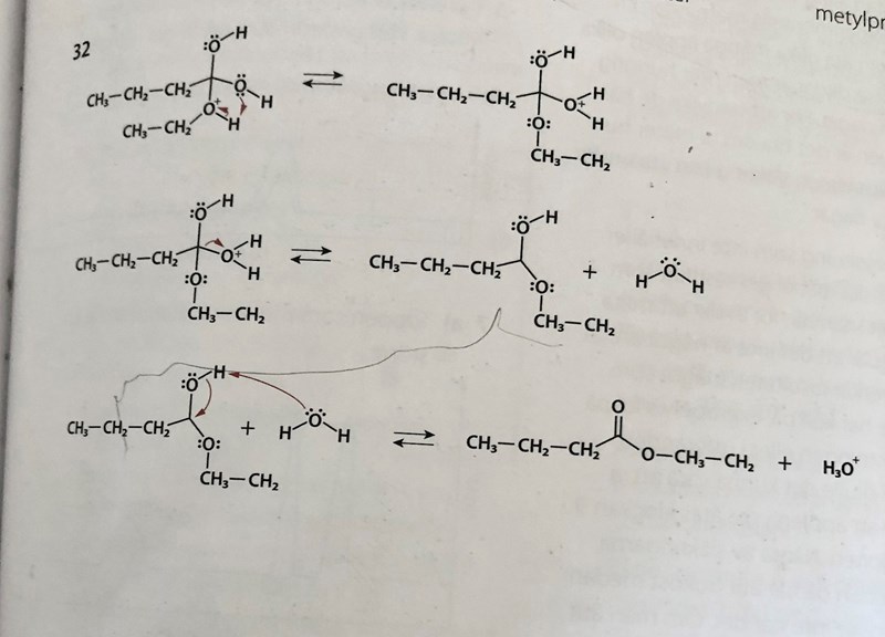 Rita ut reaktionsmekanismen för kondensationsreaktionen då den aprikosdoftande estern etylbutanoat bildas. Reaktanterna är etanol och butan syra, samt en stark syra som katalysator.