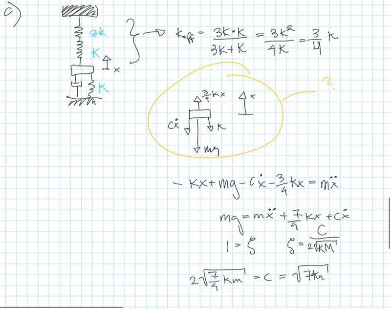 Hej, jag vet inte riktigt hur jag ska tänka då jag skriver ut riktningar till krafterna här vid dämpningar och fjädrar och hur det överförs till tecken i ekvationen. Jag vet att uppsättningen av ekvationen stämmer för det är det enda sättet för mig att få rätt svar. Men förstår inte hur alla förutom m*g kan ha samma tecken på vänsterledet. .jpg?width=800&upscale=false)