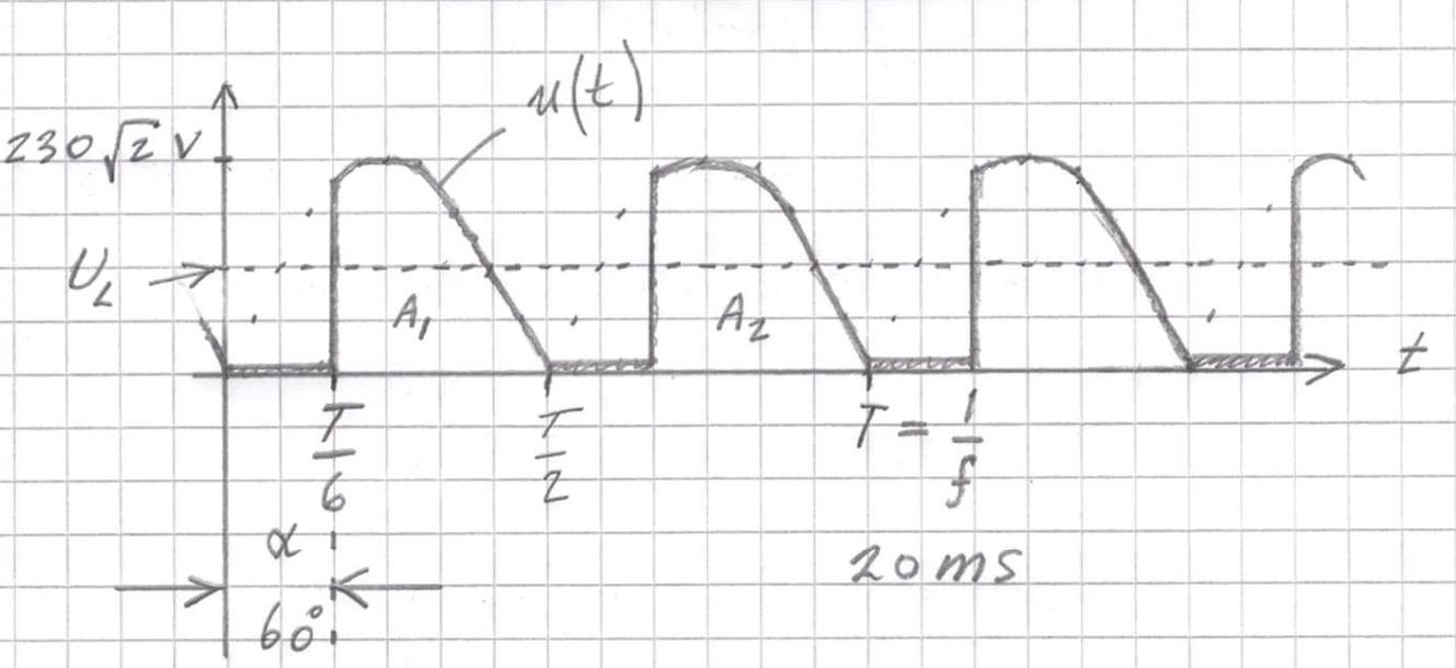 När tyristorn börjar leda styrs av strömmen på gate'n och i figuren är de oanslutna så att säga att tyristorn tänder vid just T/6 finns inget stöd för i figuren. Kanske det fanns mer information i uppgiften?