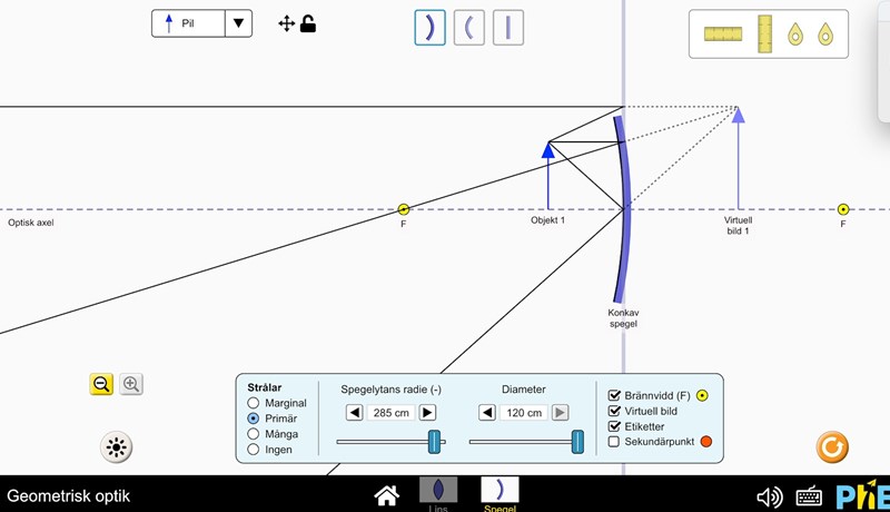 Pieter Kuiper skrev:Det finns en bra simulering: https://phet.colorado.edu/sims/html/geometric-optics/latest/geometric-optics_sv.html