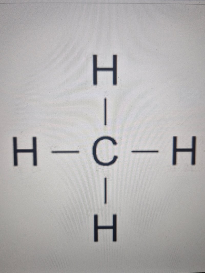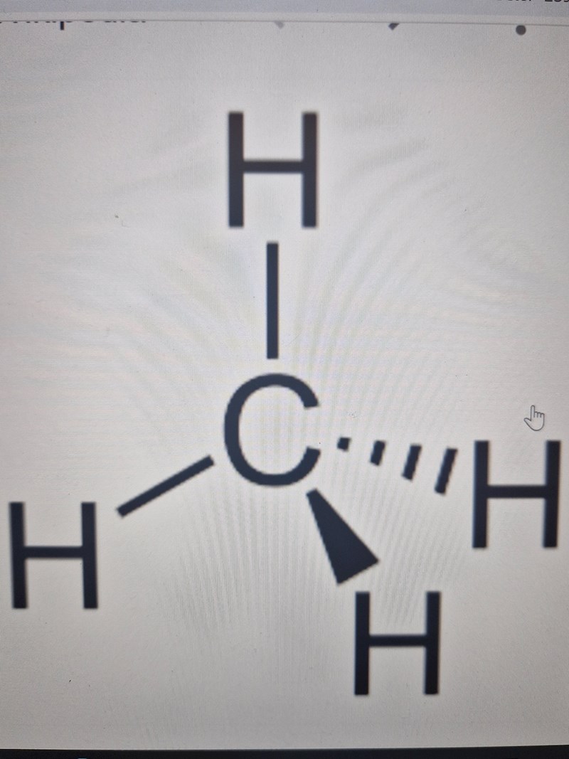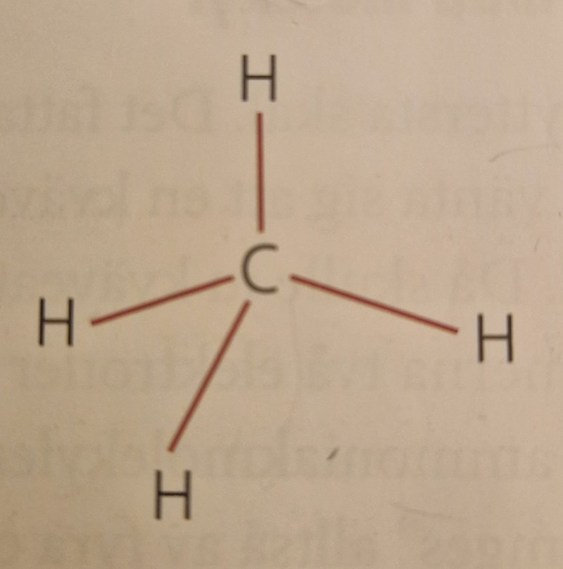 Den andra bilden visar en stereoformel där man visar hur atomerna är arrangerade i rymden. Just den visar att metanmolekylen har formen av en tetraeder.