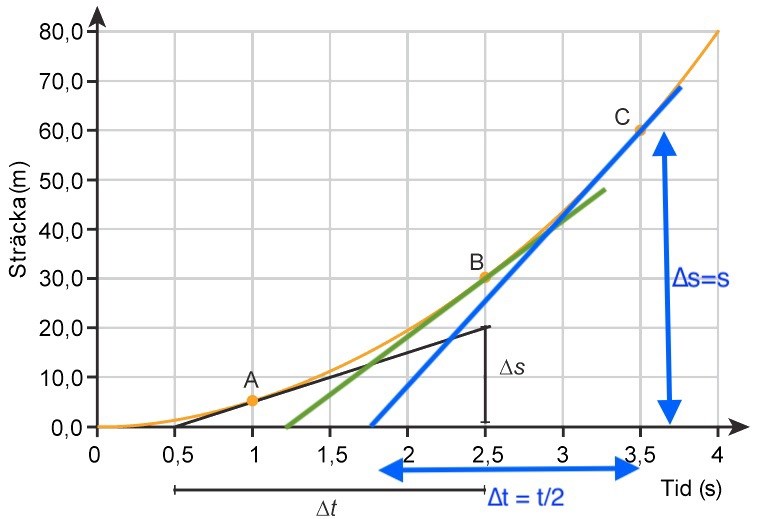 Den momentana hastigheten är dubbelt så stor som medelhastigheten från stillastående.