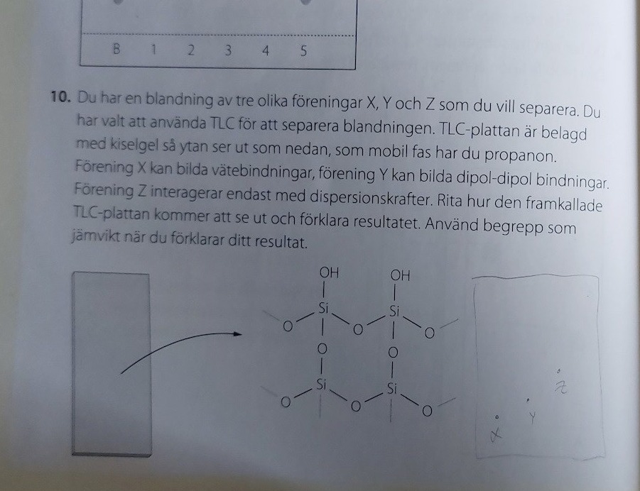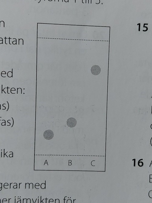 Utifrån vad man vet om ämnena och mobilfasen+plattan kan man dock förutse ganska bra hur ämnena separeras, precis som i din fråga. Rent praktiskt får man dock prova en kombination mobilfas+plattta och se om en tillräckligt bra separation sker. Är separationen inte bra nog, får man ändra på t.ex. mobilfasen och prova igen.