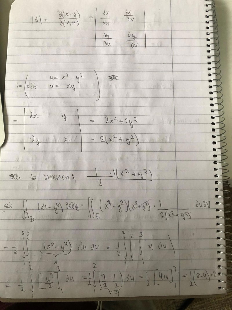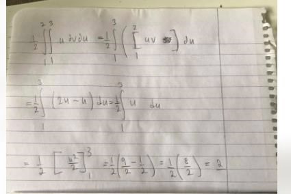 Skaft skrev:Det viktiga är inte ordningen, utan att du matchar rätt gränser med rätt variabel. Men du integrerade först u till u^2/2, och sen satte du in gränserna för v (3 och 1) istället för gränserna för u (2 och 1).