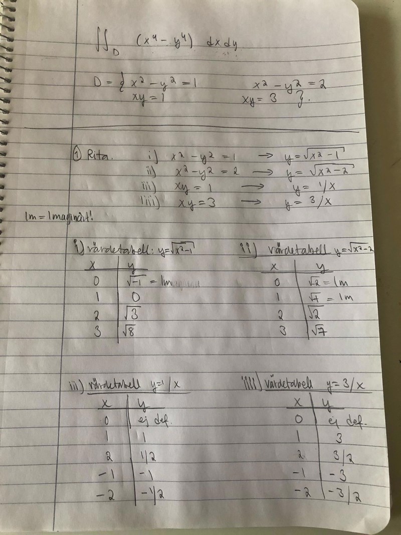 Områdets gränser är krångliga när de uttrycks i x och y. Det finns inga raka väggar som begränsar området, så integralen skulle behöva delas upp i flera. Det blir stökigt. Ett alternativ då är att hitta ett variabelbyte, som ger ett enklare område - och faktum är att dina gränser avslöjar hur.