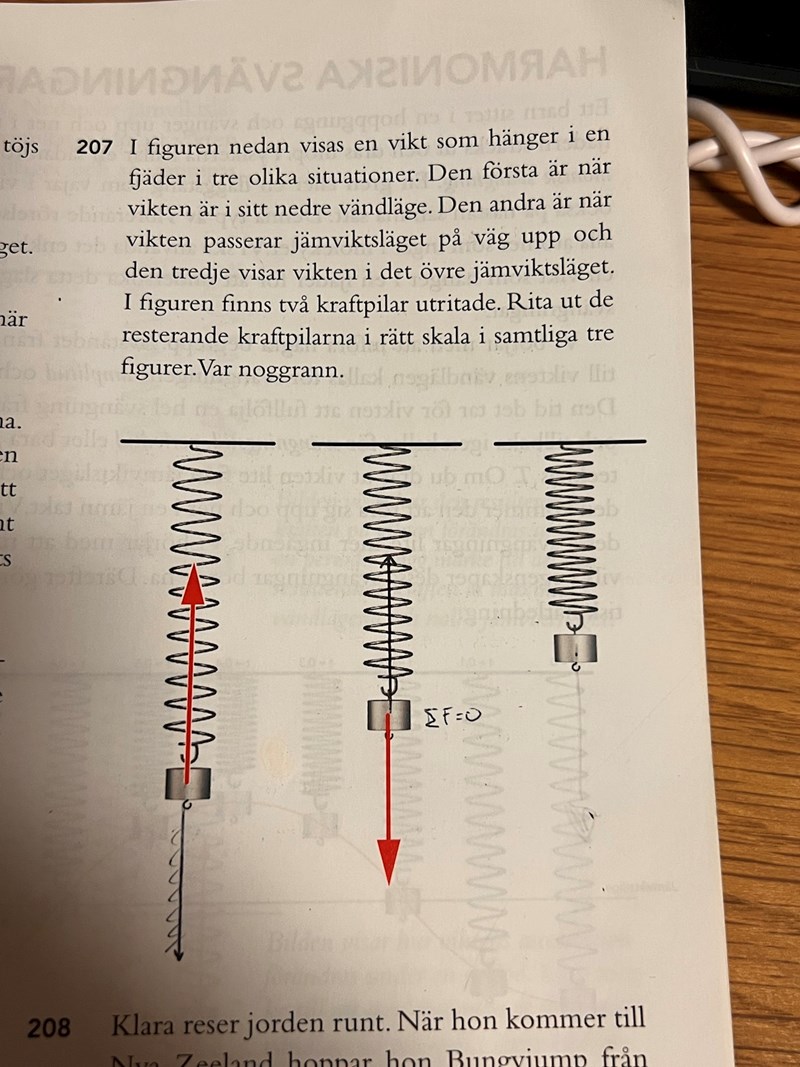 .Jag tycker pilen borde peka neråt för jämviktsläge är väll där vikten är i den 2 figuren. Och jag tänkte att fjäderkrsften alltid pekar mot jämviktsläget.
