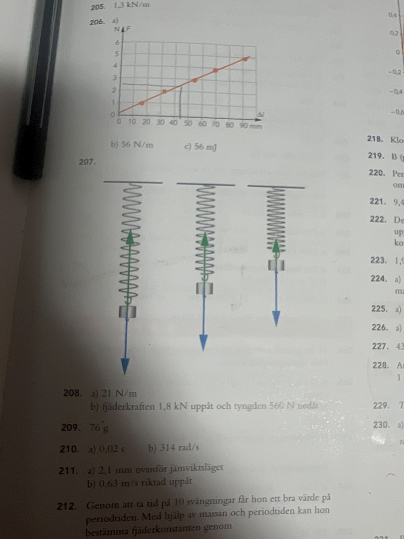 jag trodde att kraften på tredje fjäderkrsft ska vara riktad nedåt men större än mg, för vid jämvikts så är den lika som mg men enligt F=-kx borde den vara större för nu har den viss längd. Problemet är jag hade helt fel. Detta stod i facitet.