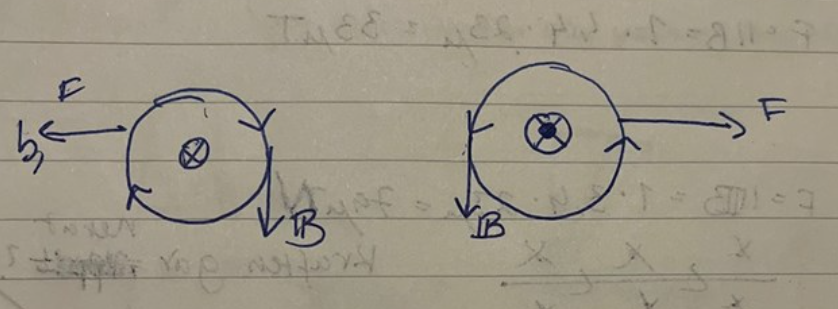 Första bilden är hur den nedre ledarens magnetfält påverkar den övre. Så allt till vänster går ut ur papperet.