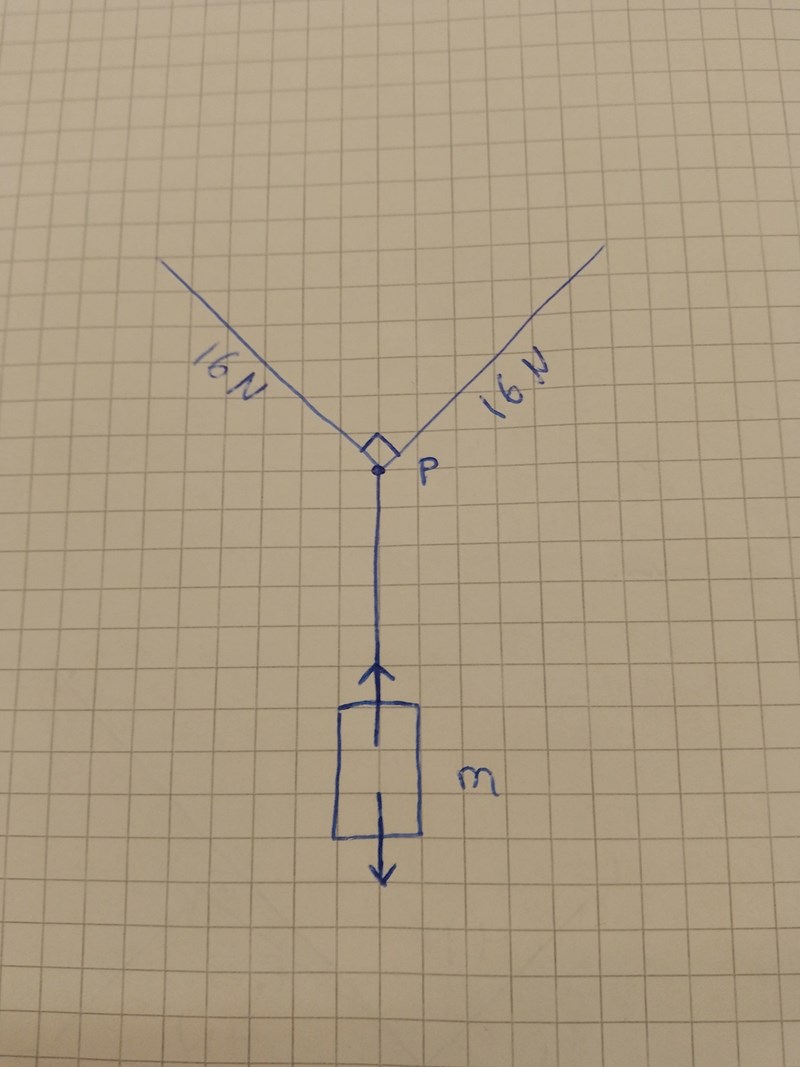 En vikt med massan m hänger i en lätt tråd. Tråden är i punkten P fäst i två andra trådar som bildar vinkel 90 grader med varandra. Kraften är 16 i vardera av dessa snett riktade trådar.