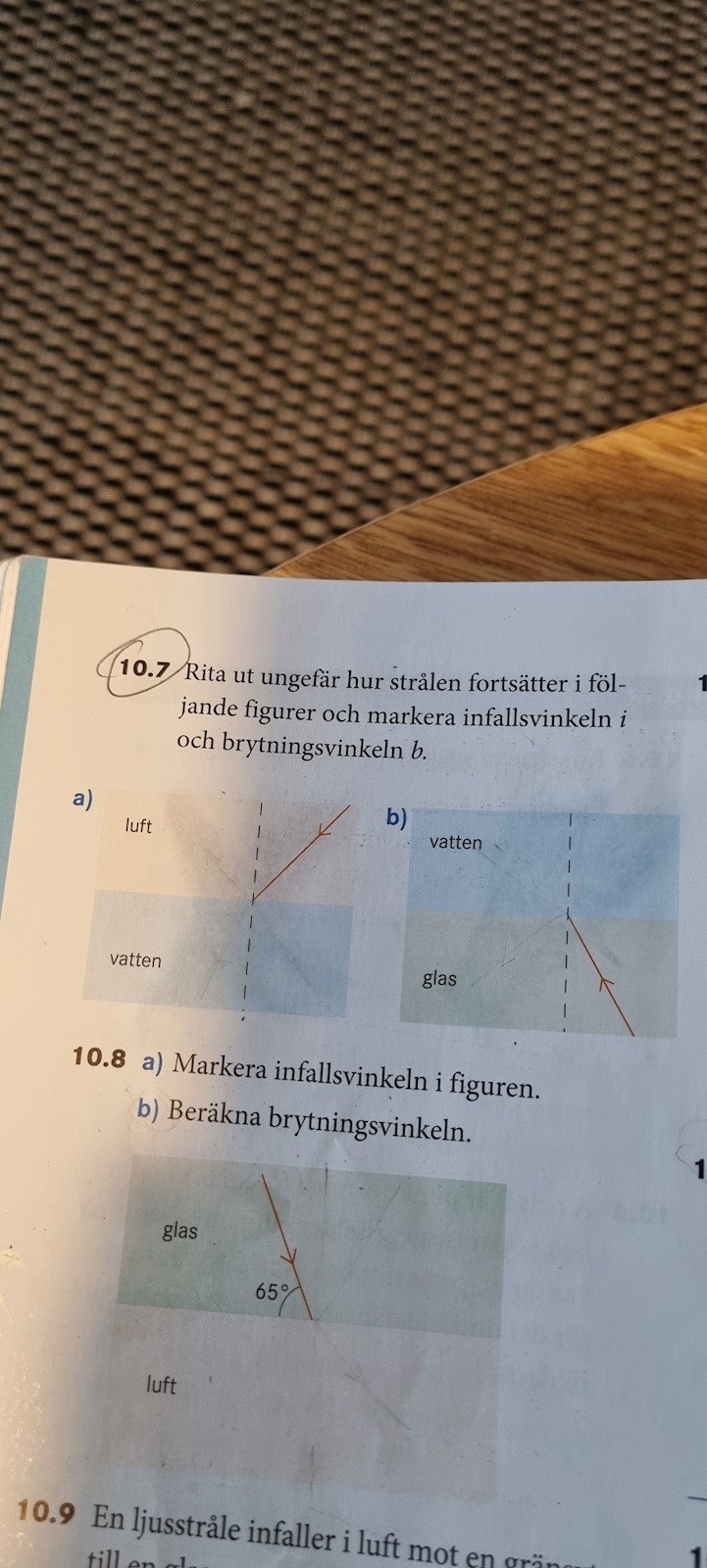 Min fråga gäller a). I facit har de ritat ut en reflektionsvinkel. Reflektionsvinkeln bildas väl enbart vid totalreflektion? För totalreflektion måste väl objekt 1 vara tätare än objekt 2? Det stämmer ju inte med ämnena i fråga a) med tanke på att de totalreflekteras?