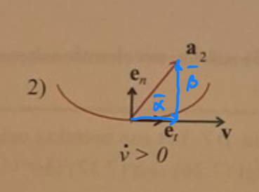 När det gäller an som då är lika med v2/rho så är den alltid i samma riktning som en i samma figur , men vi ser att e_n kan vara riktad nedåt i andra figurer vilket jag tror beror på hur accelerationen är riktad. Att v^2/rho alltid positiv är sant pga v^2 samt rho som aldrig är negativ.