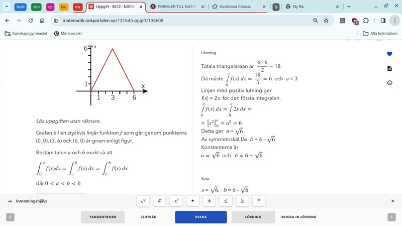 Ett tips är att dela triangeln i två trianglar genom att rita linjen x=3 och försöka hitta a och b från figuren.
