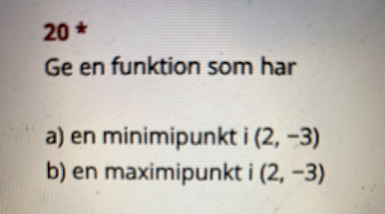 Men uppgifr 20 b gäller att ge ett exempel på en funktion som har en maximipunkt vid (2, -3).