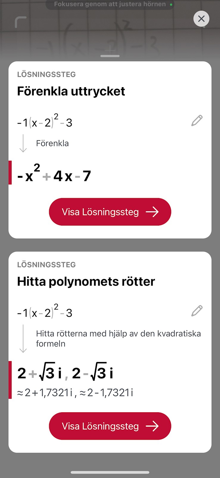 Jag skrev -1(x-2)^2 -3 på ett papper och scanna in den i appen & så får man olika förslag via appen.