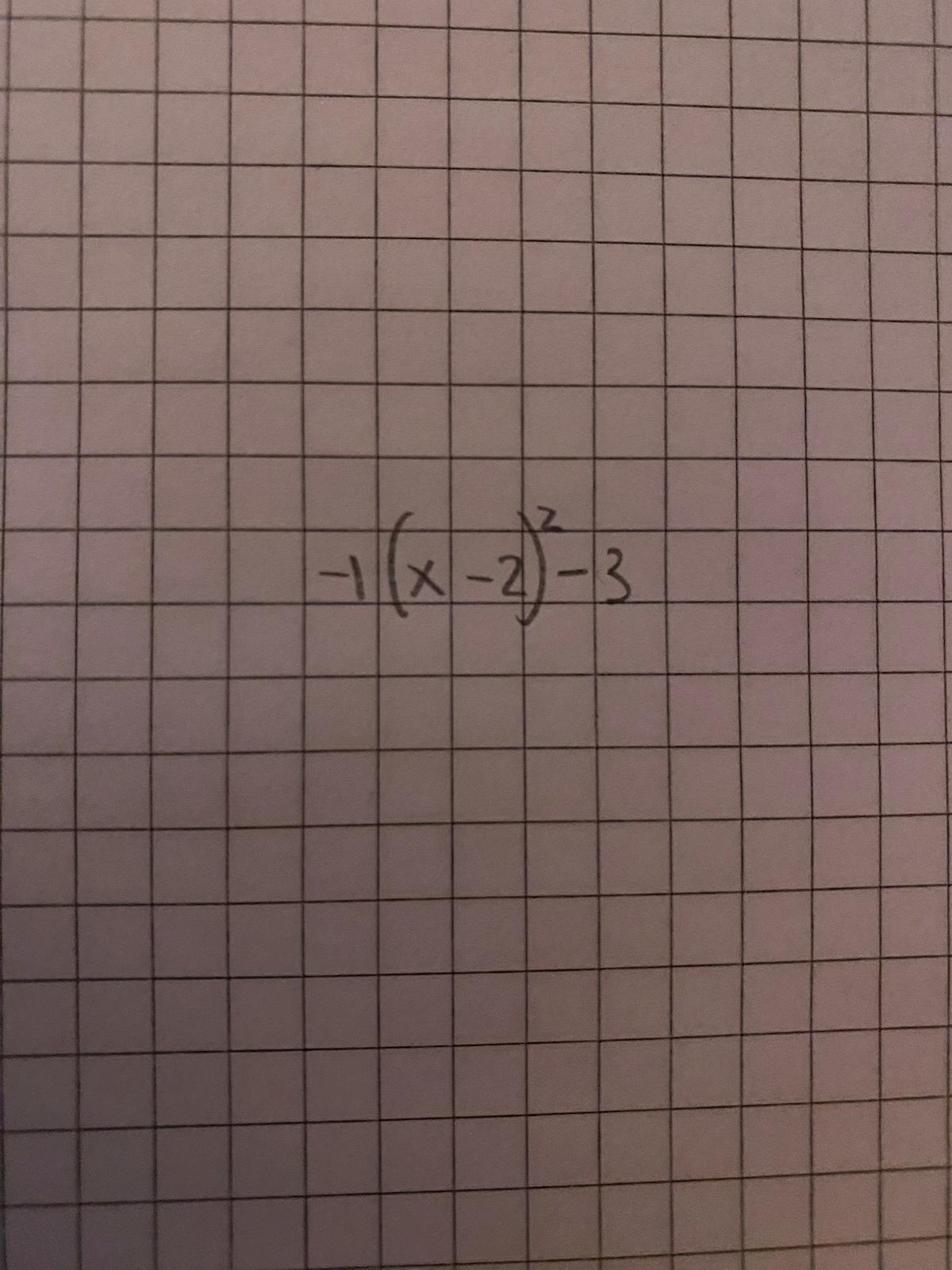 För jag gav upp efter ett tag & testa att scanna in -1(x-2)^2 -3 i en app som räknar ut utryck på olika vis steg för steg så man liksom kan se stegen & förstå vart man själv typ gjort fel/tänker fel, appen ger olika förslag på hur man kan räkna & visar stegen, men den appen gav inte heller ut ett svar som ger: -(x-2)^2 -3 =/