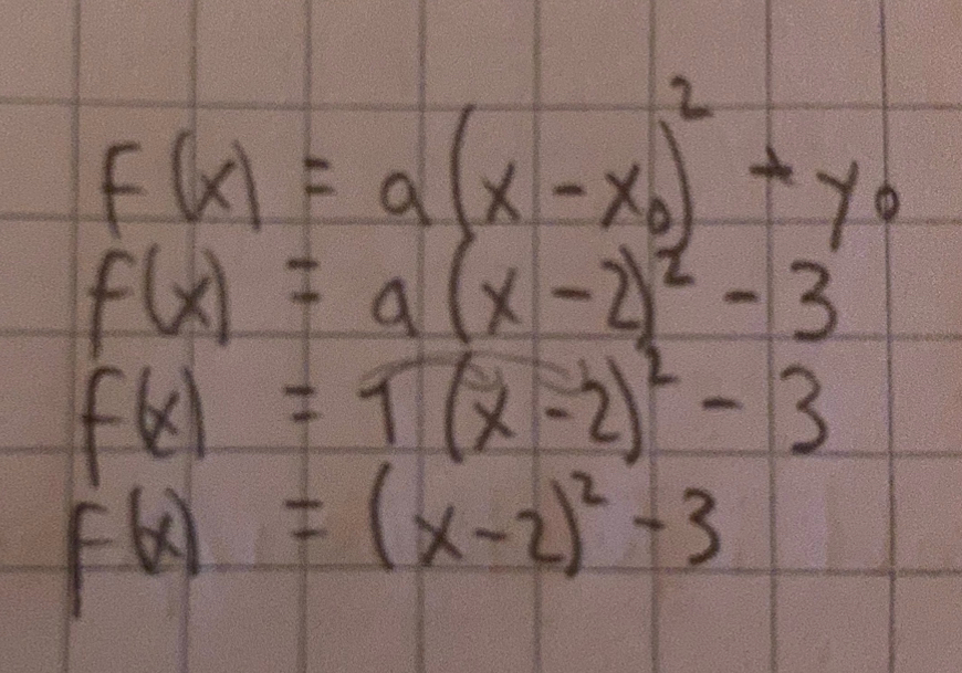 Facit säger f(x) = (x − 2)2 − 3 , så vill förstå vad formeln säger och betyder även om jag kanske kan gå runt de och lösa de på annat vis. Jag kan placera in punkten i denna formel, men vet inte hur jag ska räkna mig till det, eller hur jag ska använda formeln riktigt...