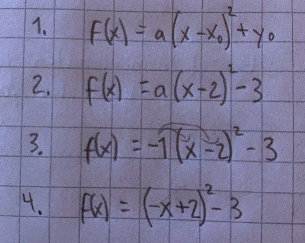 **Undrar också: om det står f(x) = (x − 2)2 − 3, så betyder det att de framför parentesen (på a:s plats) står en osynlig +1 där. Betyder det då att f(x) = -(x − 2)2 − 3, betyder att de står -1 där a egentligen skulle stå?