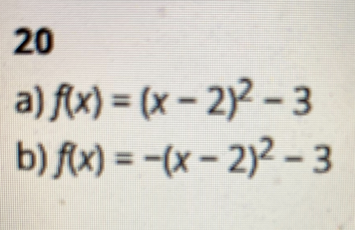 (x-2)^2-3 till -x^2-4x-7 (en -7 som sen blir +7, när man tar -x^2*-1, för att få den x^2, men att man får tänka tvärtom dvs att det ska vara -7 parabeln skär och inte +7 då parabeln ska vara en minimipunkt)