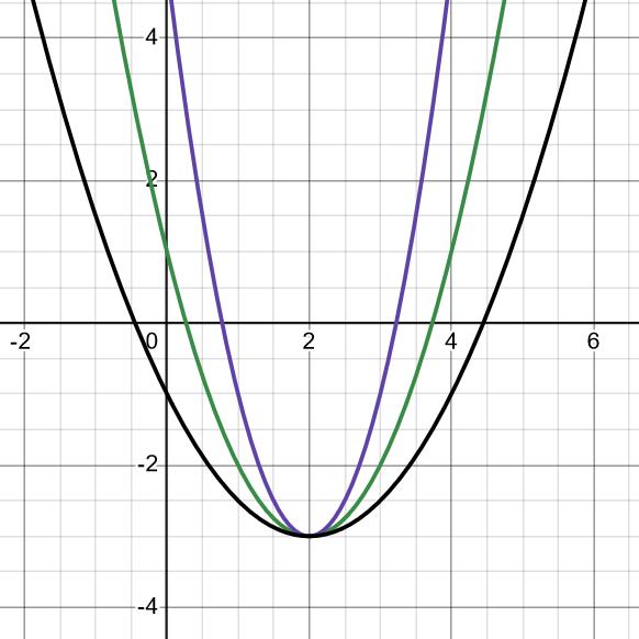 De kan alla beskrivas som f(x) = k(x-2)2-3 men k-värdena är olika - den svarta har k-värdet 0,5, den gröna 1 och den blålila 2.
