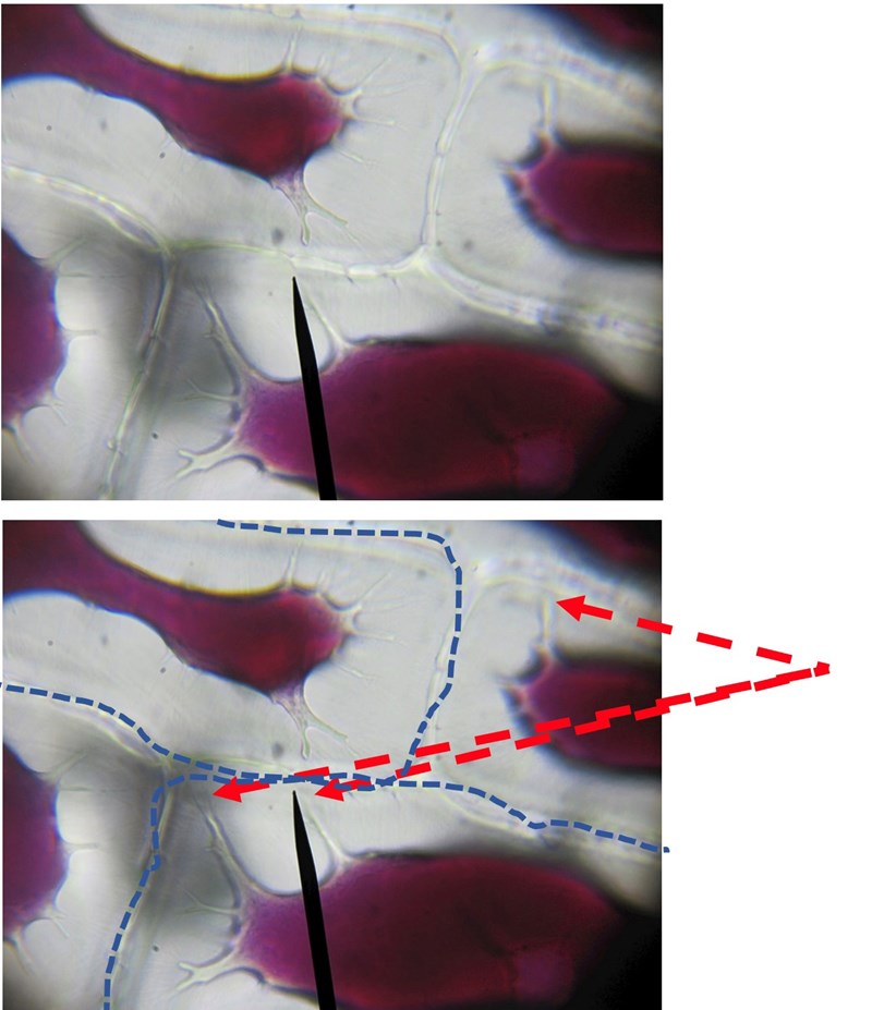 Men i den nedre bilden syns, i de "vita" delarna en gräns/skugga, mellan cellerna. Och denna gräns är växtcellens kontur, d.v.s. där cellväggen är (illustrerat med den streckade blå linjen i bilden nedan).