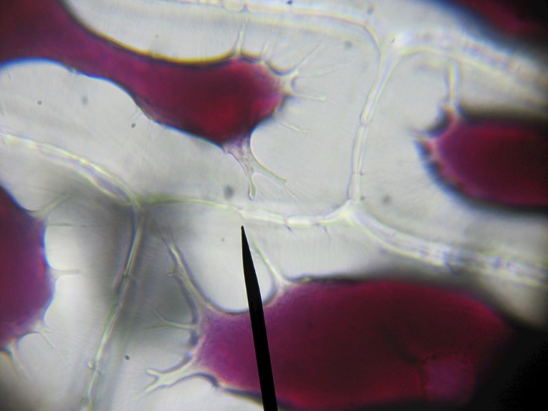 Du kanske även kan se hur den rödfärgade delen av cellen sitter fast i cellväggen genom trådlika utskott (röda pilarna pekar på några).