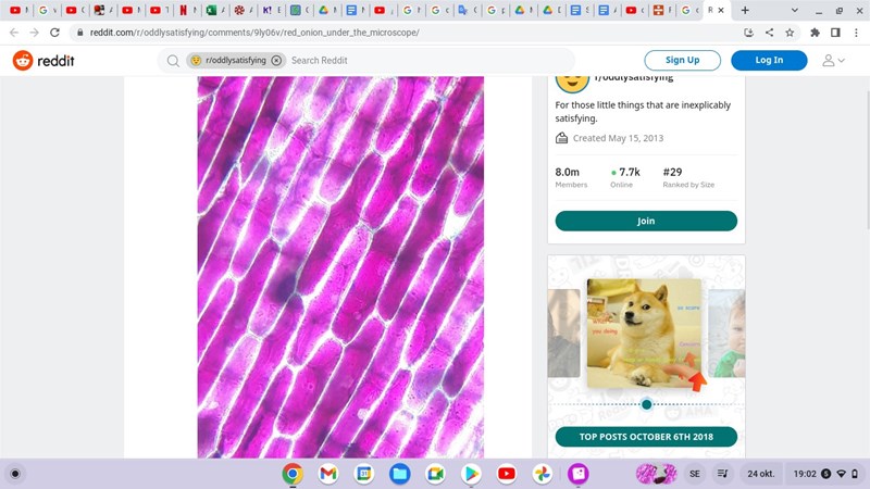 Den nedre bilden visar visar på ett föredömligt vis (bra och klar bild!) att något skett med rödlökscellerna. Nu är skalan olika mellan bilderna, den nedre har en högre förstoring, så det som visas är bitar av fyra eller (till skillnad från de <40 celler i den övre bilden).