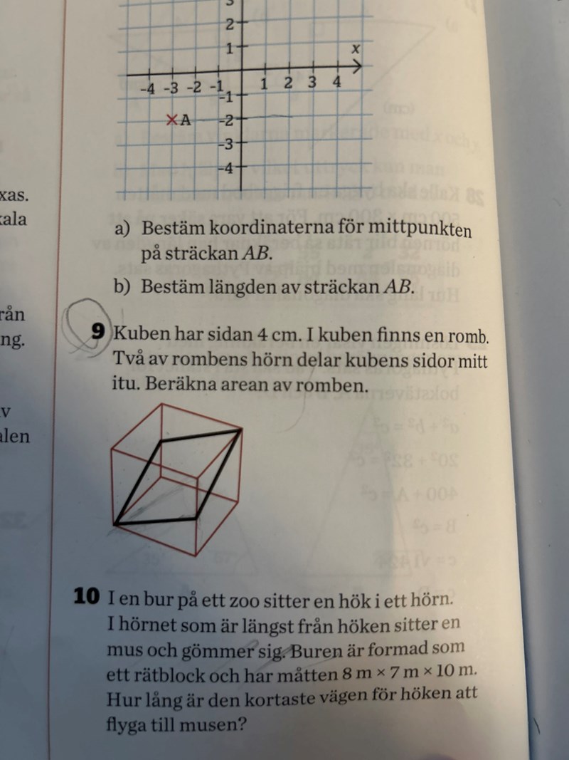 sen tog jag 4,47^2 + 4,47^2 för att få diagonalen, eftersom kuben har lika långa sidor har även romben det så roten ur 39,97=6,32