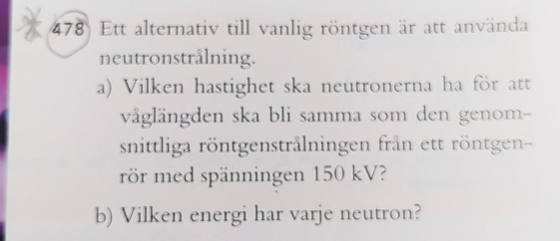 Jag har ingen aning hur jag ska göra med den här uppgiften. Antar att jag ska använda att lamnda=h/(mv) på något sätt och den ska vara samma för som genomsnittliga röntgenstrålningen där spänningen är 150 kV. Men hur vet jag genomsnittliga röntgenstrålningen?