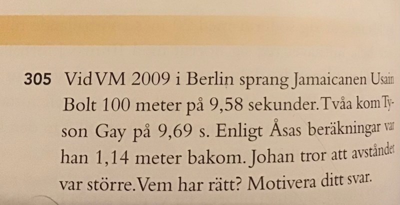 10,32m/s och tar man det gånger 0,11 så får man fram 1,14 m. Men jag förstår inte hur jag ska förklara för enligt facit har Johan rätt