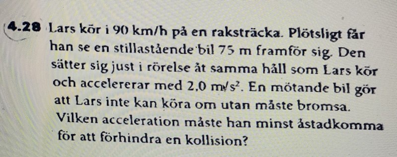 Alternativt kan man tänka sig att Lars fortsätter med 90 km/tim, samtidigt som den stillastående bilen snabbt accelererar till samma hastighet utan att en olycka sker. Det får då ta högst 6 sekunder. Lars har då kört 150 meter och den andra bilen 75 meter.