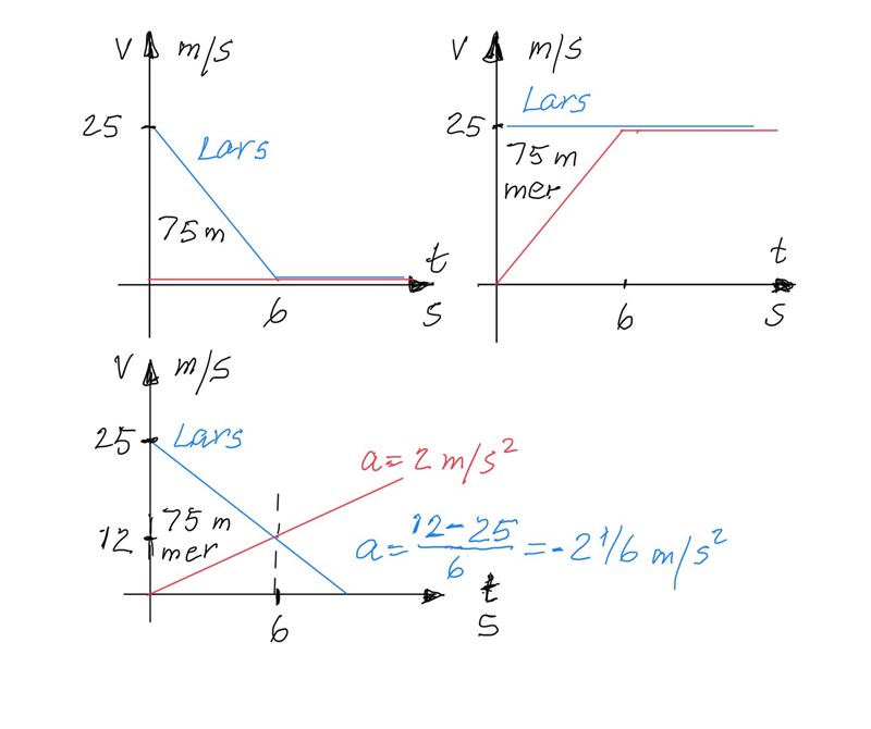 Med 25*x/2 = 75 räknar man ut hur många sekunder det tar för Lars att stanna om han ska färdas 75 meter till. Och då krockar han ju garanterat inte.