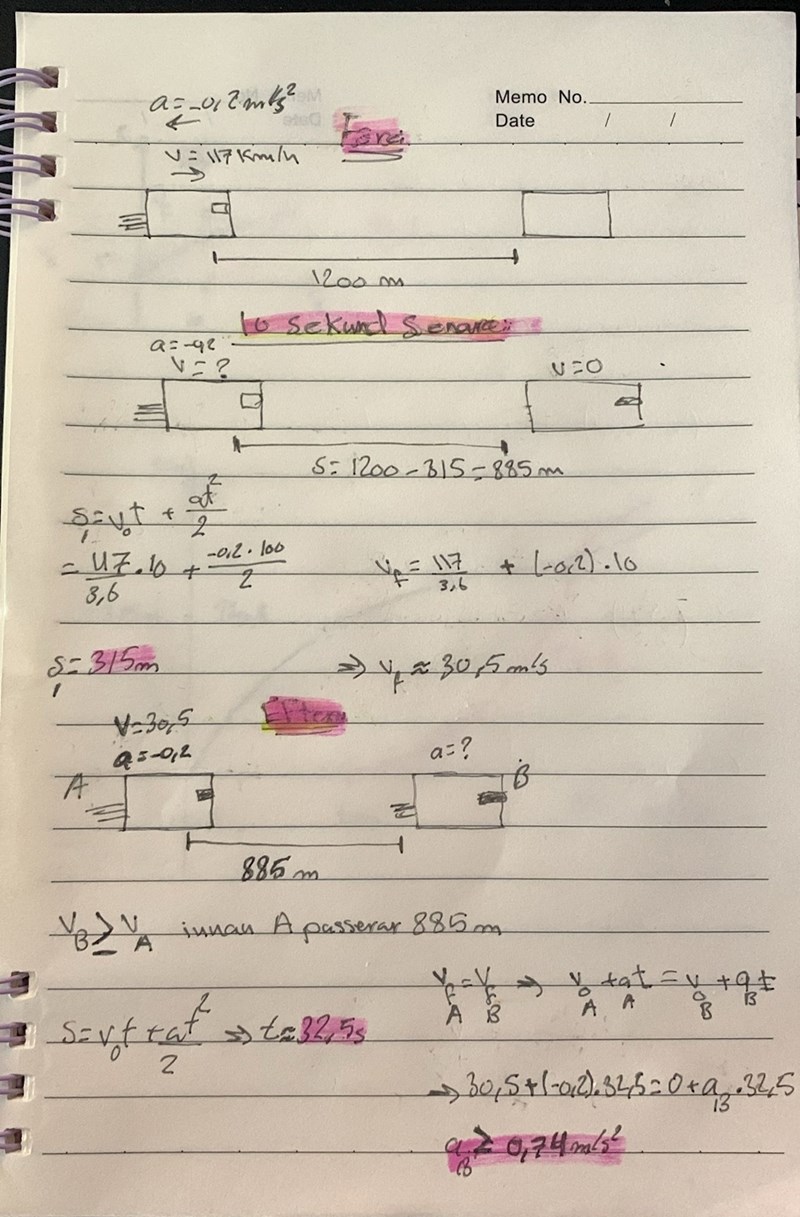Föraren på ett tåg med hastigheten 117 km/h upptäcker ett stillastående lok 1200 m längre bort. Föraren börjar genast bromsa och signalerar samtidigt. 10 sekunder senare börjar äntligen loket att sätta sig i rörelse bort från tåget. Anta att de båda rörelserna är likformigt accelererade, och att tågets acceleration är -0,20 m/s2. Hur stor måste lokets acceleration minst vara för att enkollision skall undvikas?