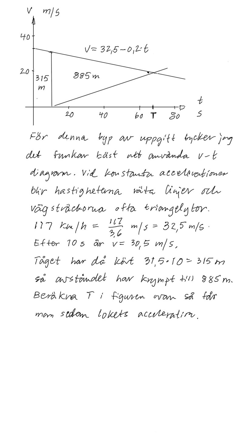 Pieter Kuiper skrev:SaS.. skrev:Föraren på ett tåg med hastigheten 117 km/h upptäcker ett stillastående lok 1200 m längre bort. Föraren börjar genast bromsa och signalerar samtidigt. 10 sekunder senare börjar äntligen loket att sätta sig i rörelse bort från tåget. Anta att de båda rörelserna är likformigt accelererade, och att tågets acceleration är -0,20 m/s2. Hur stor måste lokets acceleration minst vara för att enkollision skall undvikas?