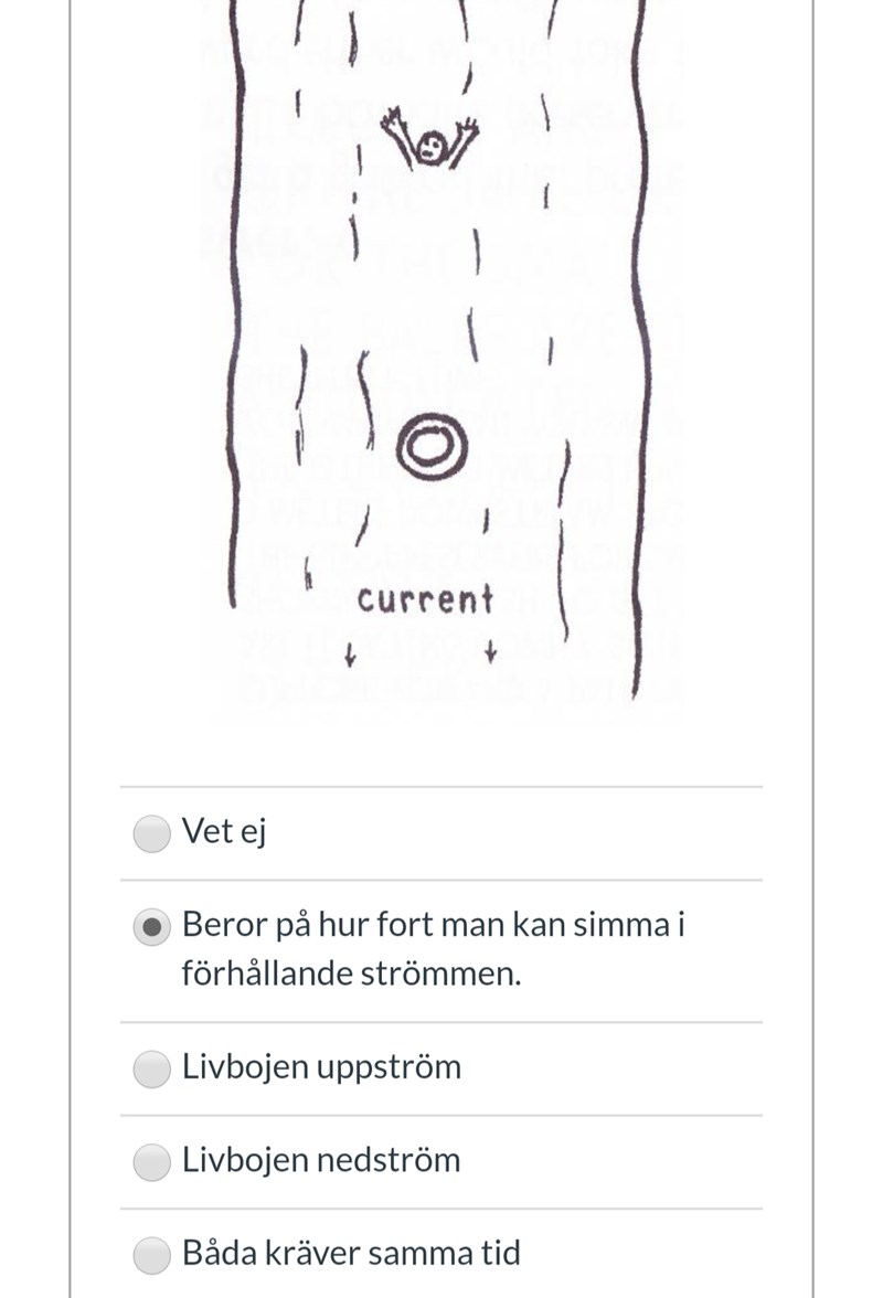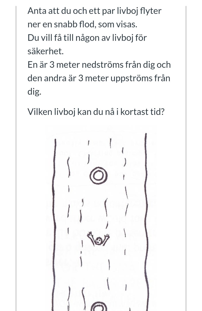 Men anledningen till varför jag velar är för att om personen skulle simma snabbt nog uppströms så att personen är stilla relativt jorden eller till och med lyckas simma lite uppströms så hade personen nått livbojen på 3 sekunder eller mindre.