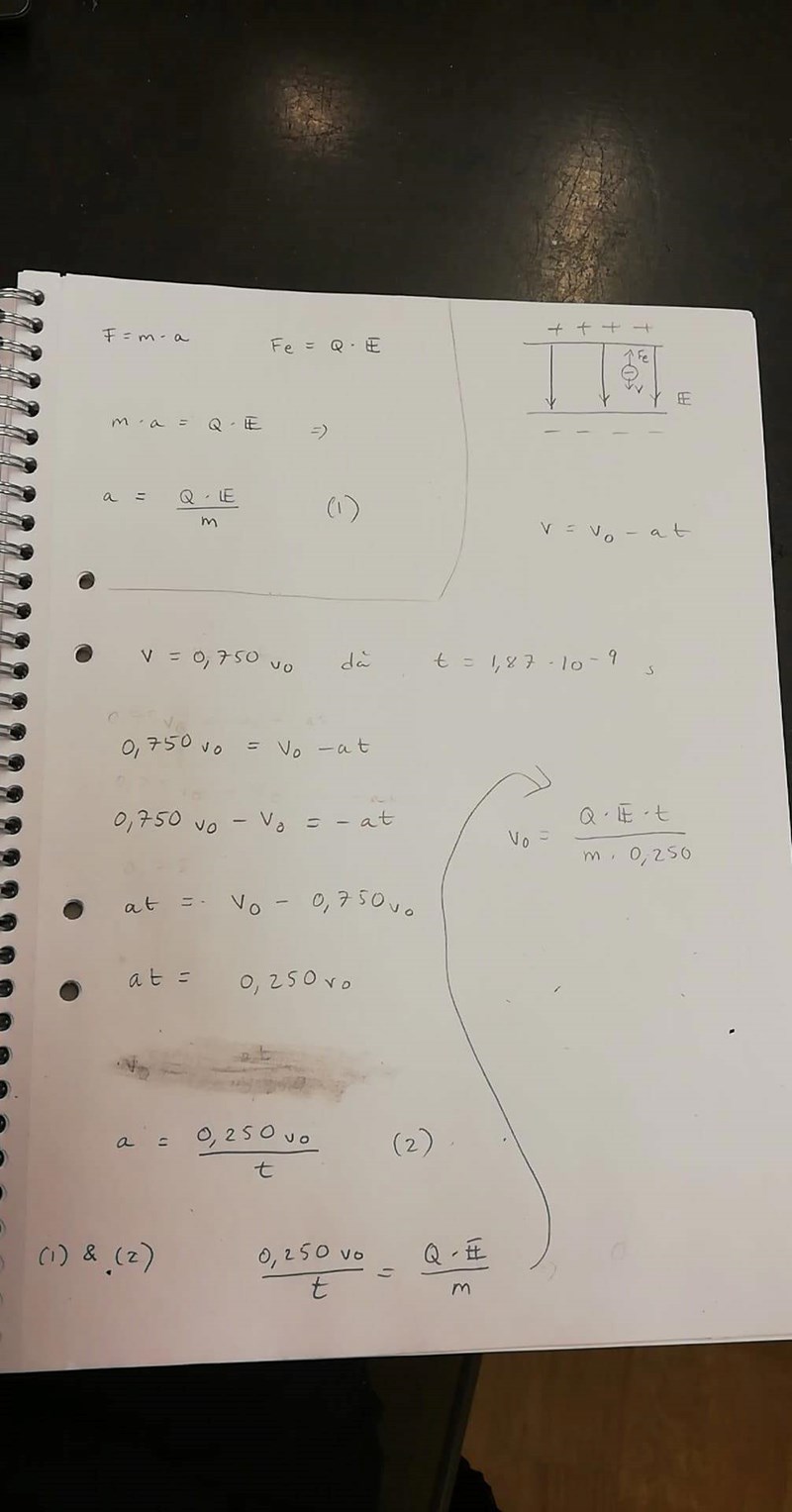 Efter tiden 1,87 ns har elektronen 75,0 % av sin ursprungliga fart. Hur stor var elektronens