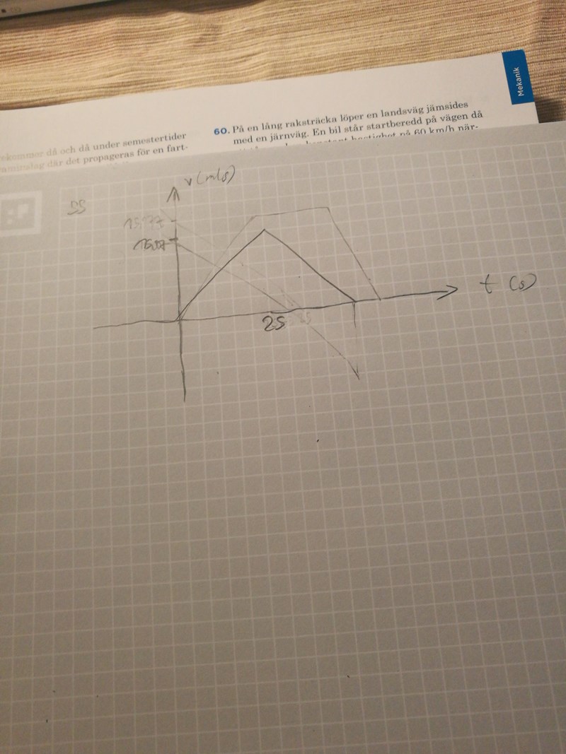 Grafen blir då en rät linje som utgår från origo, har konstant lutning tills den når maxhastigheten varefter den vänder neråt med en annan konstant lutning tills den når tidsaxeln igen. Hela förloppet tar 25 sekunder.