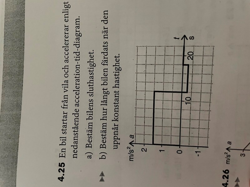 och b med formeln s=v0t +((at^2)/2) där det blir 1.5*12,5^2/2=117.1875m och 18,75*7,5-0,25*7,5^2/2=133.59 som tillsammans blir ≈250,8m men i facit står det 220m