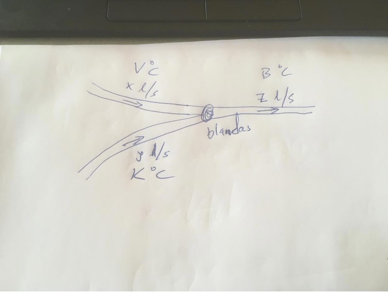Kan du försöka teckna ett uttryck för sluttemperaturen om en liten mängd ( liter) varmvatten blandas med en liten mängd () kallvatten blandas?