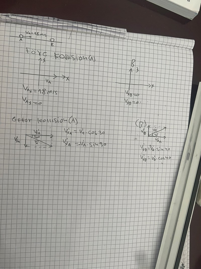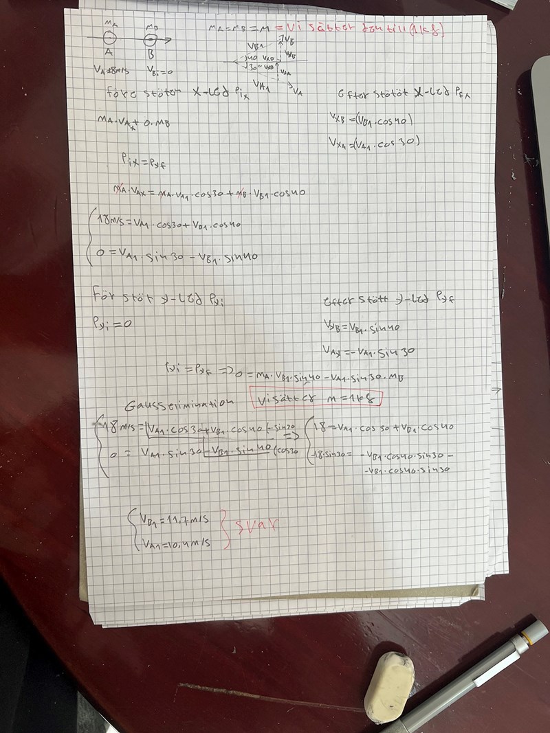 Sen tar man rörelse mängden före och efter för x-led och y-led då får man en ekvation system som man löser. Min första hade jag slarv fel på sen när jag räckande om då fick jag hastigheternas som stor i 3#