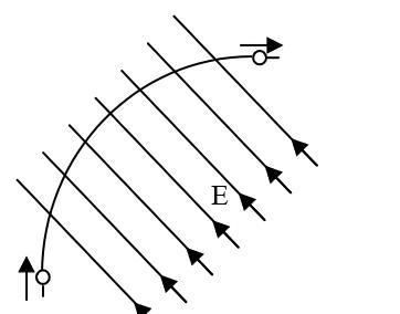 En elektron med hastigheten 2,0 Mm/s passerar genom ett homogent elektriskt fält med fältstyrkan E så som figuren nedan visar. Passagen tar 3,0 ns. Efter passagen har elektronen ändrat rörelseriktning och rör sig då vinkelrätt mot sin ursprungliga rörelseriktning. Hastigheten i den nya rörelseriktningen är 2,0 Mm/s. Beräkna det elektriska fältets styrka.