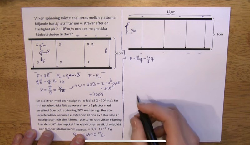 I fall ett antar jag att det finns en början till uppgiftstexten där man nämner ett vinkelrätt B-fält (magnetfält). Det finns också "X" utsatta för att markera riktningen på B-fältet. Vid ett "X" står det till och med B!