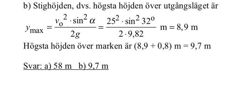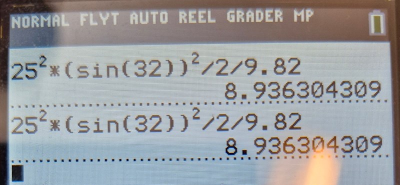 Jag lyckas dock inte få det i miniräknare när jag räknaren på egen hand. Jag får hela tiden Ymax till 861,7 meter istället för 8,9 meter. Jag har dubbelkollat att räknaren är ställd på grader, vilket det var från början. Vad gör jag för fel??