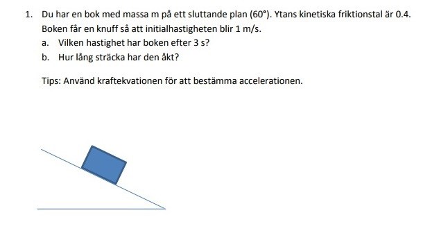 Uppgiften är lite otydlig: Det framgår inte om initialhastigheten är uppför eller nedför planet.