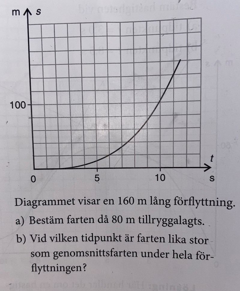 Jag har beräknat genomsnittsfarten 14 m/s genom att dra en sekant. Men sen vet jag inte hur jag ska beräkna vid vilken tidpunkt som farten är 14 m/s, man fick ju inte formeln för kurvan.
