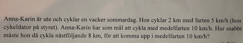 Tänker jag rätt om jag bestämmer tiden t1 med formeln s1 =(v+v1)t1/2 när s1=2km och v1=5/3,6 m/s & v=0 m/s och sedan bestämmer ttot med formeln Stot=vmedelttot, (stot=10km) för att sedan subtrahera den totala tiden med t1 för att bestämma vad v2 är med formeln s2=(v+v2)t2/2, s2=8km, v=0m/s och t2= ttot-t1 ?