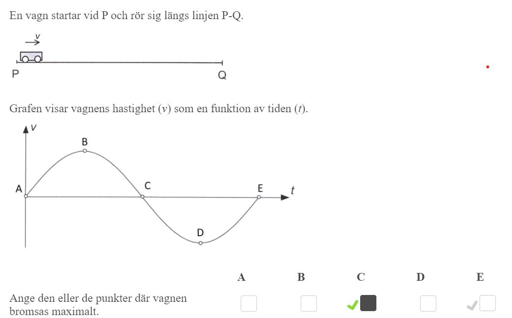 Varför E? Då vagnen bromsas maximalt är accelerationen (lutningen på grafen) som mest negativ. Alltså vid C, men vid E är den positiv. Har det någonting att göra med att hastigheten är negativ (under x-axeln) precis innan och därmed är det tvärt om?