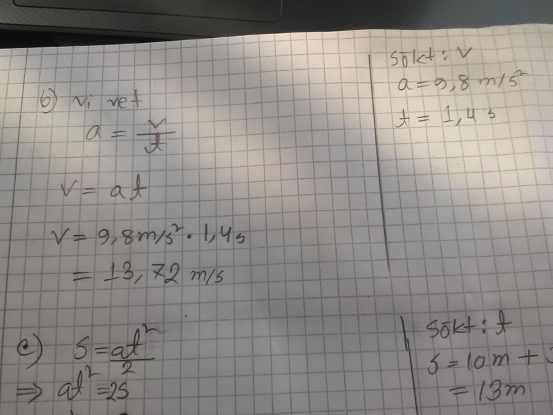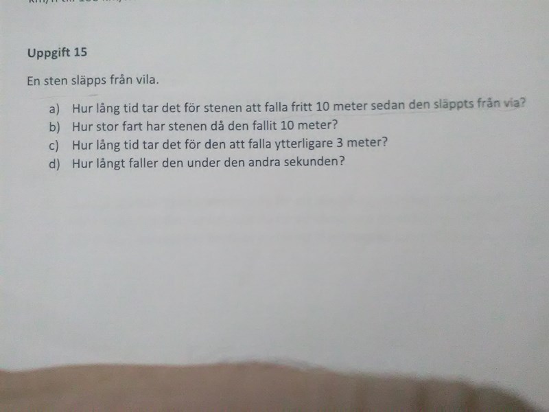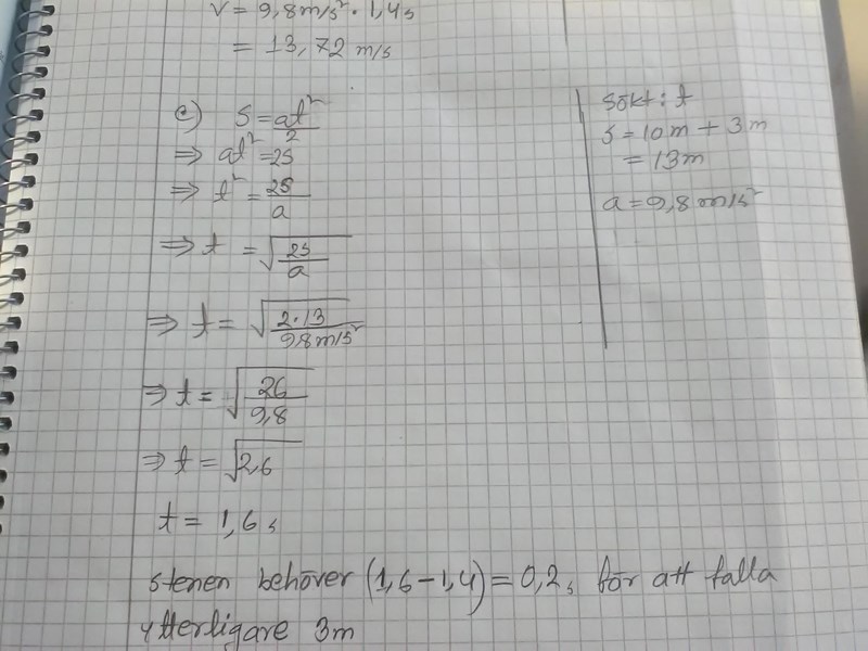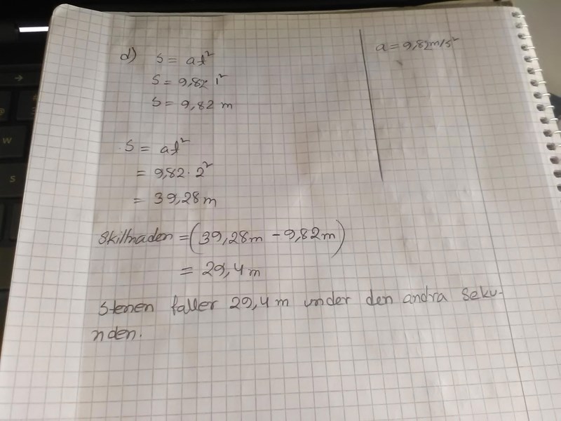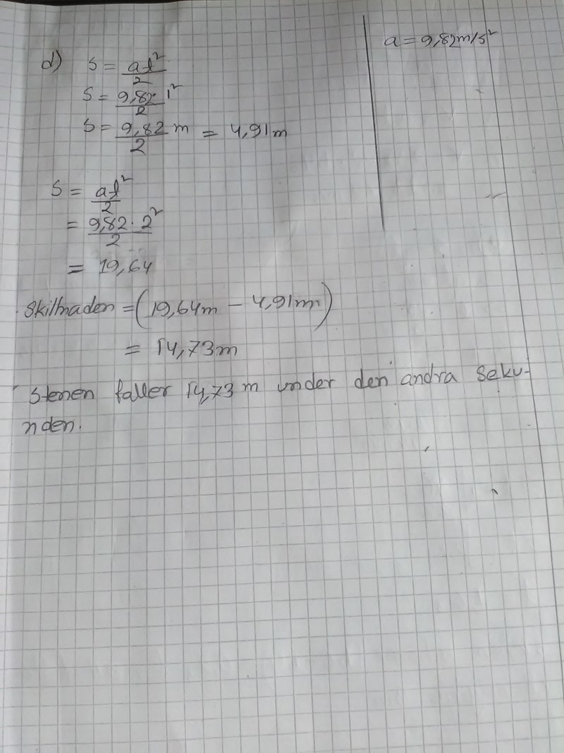 Om fråga d): Hur långt har stenen fallit efter 1 sekund? Hur långt har den fallit efter 2 sekunder? Hur stor är skillnaden?
