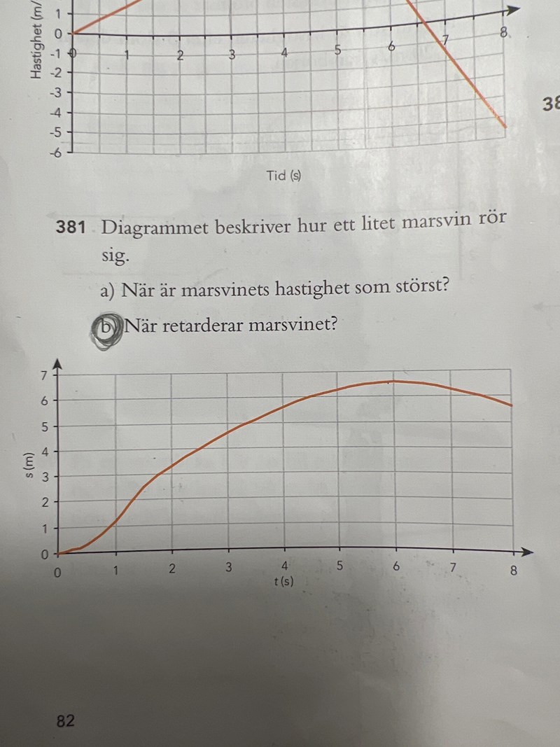 Hej, jag behöver hjälp med uppgift b. I facit står det att retardationen sker mellan 1,2 och 6 sekunder. Men jag trodde att retardation skedde efter 6 sekunder. Eftersom riktningen är fortfarande positiv till den punkten