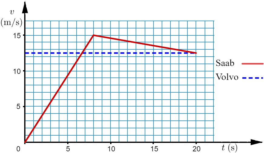 Diagrammet visar hastigheterna för en Saab och en Volvo som färdas åt samma håll på en tvåfilig genomfartsgata. Vid tiden t=0t=0 befinner sig båda bilarna precis vid ett trafikljus som just då slår om till grönt ljus. Tjugo sekunder senare passerar Saaben en vägkorsning.