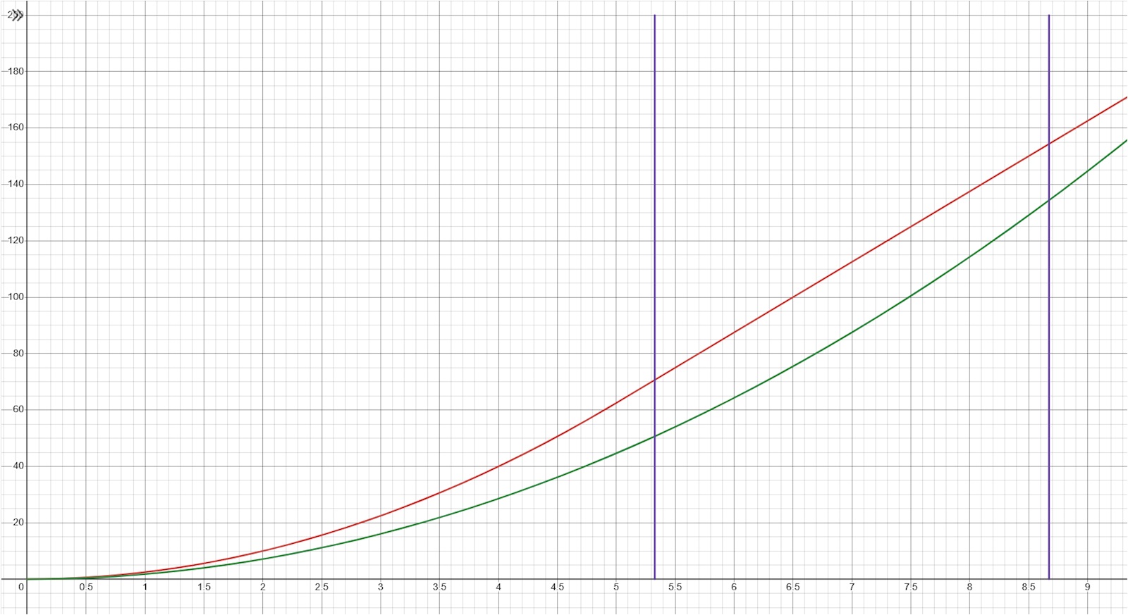 Hej! Förlåt för att jag svarar så sent, jag åt lunch sen glömde jag helt bort att du hade skrivit. Men jag har tänkt länge nu och jag tror att det betyder att i början kommer A att leda, men sen kommer B att ha kört längre. Vid två tidpunkter dock (5,3s och 8,7s) kommer A att vara 20m före B. Är det rätt??